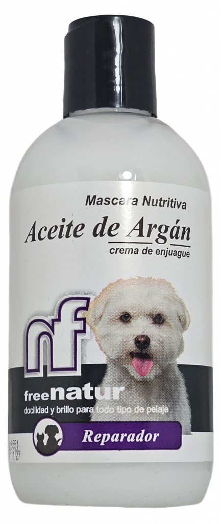 Máscara nutritiva reparadora de efecto antiestático para evitar el frizz. Enriquecida con aceite de argán, rico en Omega 6, para hidratar la piel y el pelaje, otorgando suavidad, nutrición y brillo a todo tipo de pelajes.