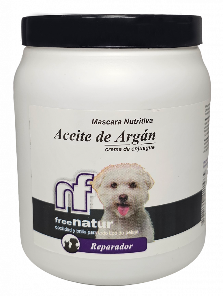 NUEVA máscara nutritiva reparadora de efecto antiestático para evitar el frizz. Enriquecida con aceite de argán, rico en Omega 6, para hidratar la piel y el pelaje, otorgando suavidad, nutrición y brillo a todo tipo de pelajes.